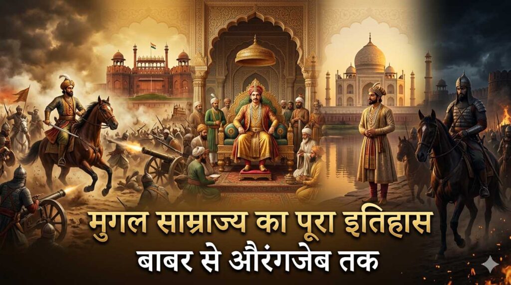 मुगल साम्राज्य का पूरा इतिहास जानें—बाबर से औरंगजेब तक, स्वर्ण युग, ताजमहल और पतन के असली कारण सरल हिंदी में।